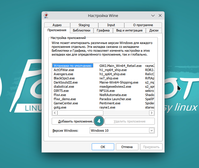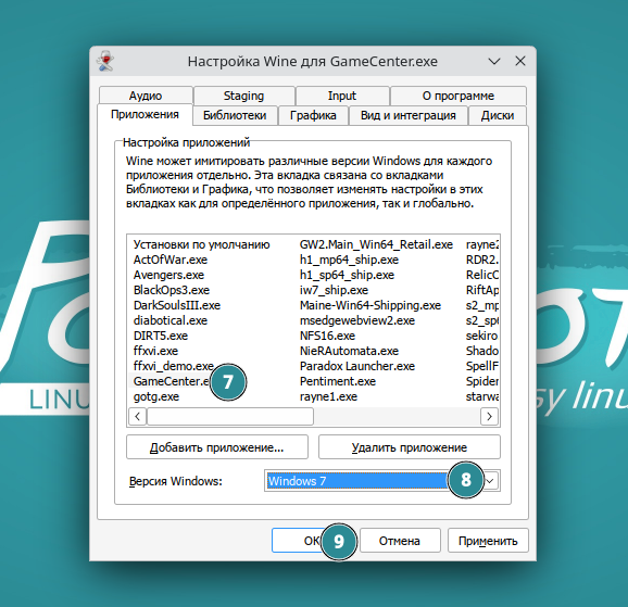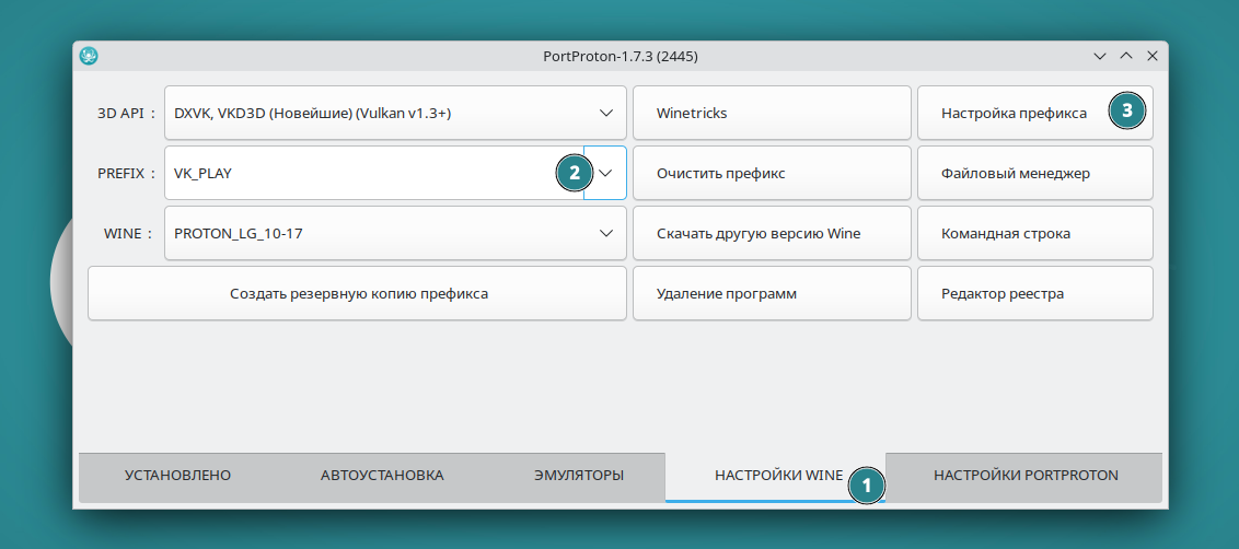 - Открыть “НАСТРОЙКИ WINE”;