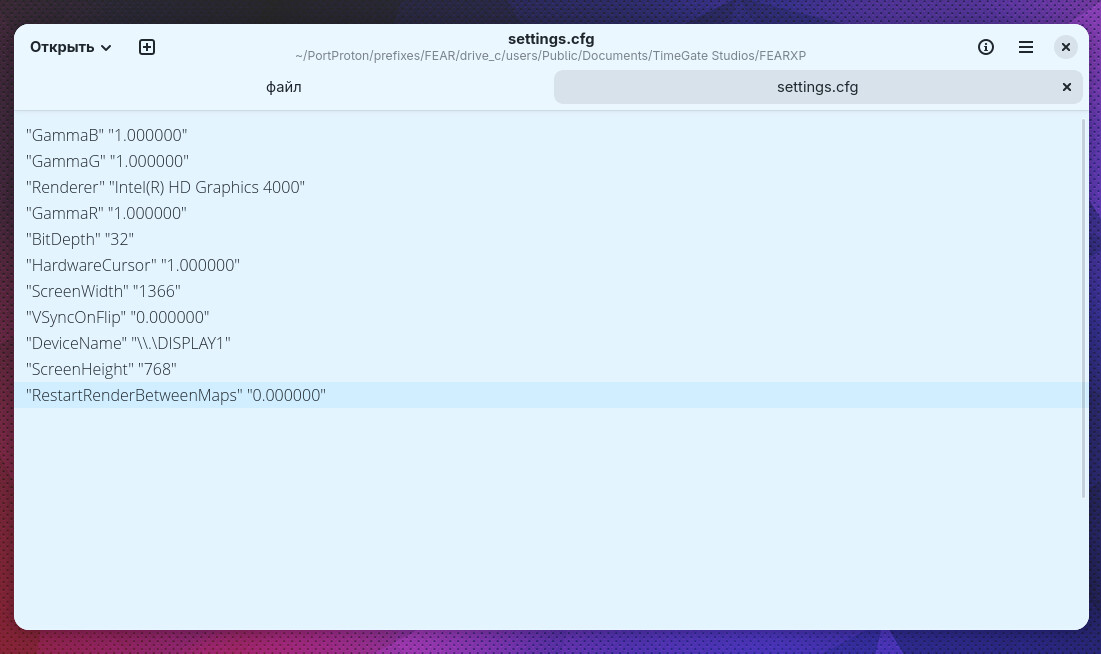 settings.cfg.Отредактируйте пункты ScreenWidth и ScreenHeight. Укажите желаемое разрешение для ширины и высоты экрана. В моём случае это 1366x768 пикселей. Сохраните изменения в файле.