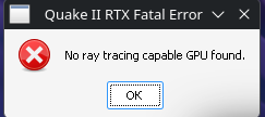 Запуск игры (Quake 2 RTX) невозможен т.к. нет аппаратной поддержки