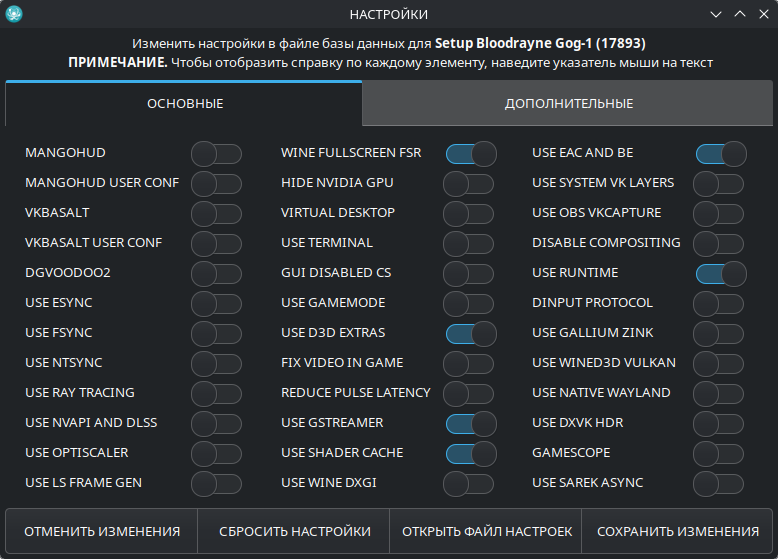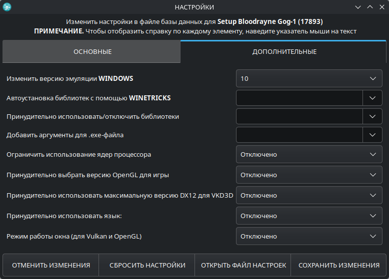 В данном окне Вы можете настроить 3D API, WINE, PREFIX